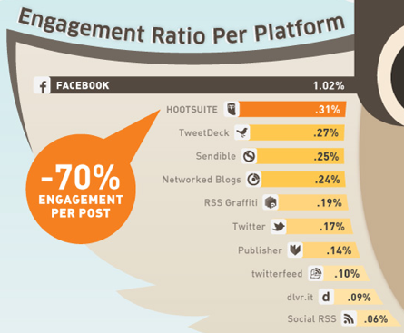Het is algemeen geaccepteerd dat het automatisch doorplaatsen van berichten naar sociale media niet goed is voor je engagement. Een analyse van EdgeRankChecker bevestigt dit: Facebook Pages die via third-party tools (zoals HootSuite en Tweetdeck) content publiceren kunnen rekenen op 70% minder engagement. Dat blijkt uit een analyse van 1 miljoen berichten op 50.000 Facebook Pages. Berichten die via externe tools werden geplaatst ontvingen 70% minder likes en reacties dan berichten die via Facebook zelf waren geplaatst.