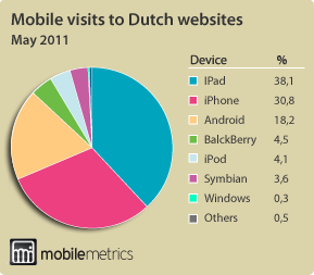 Cijfers van Mobile Metrics geven inzicht in hoe het er nu in Nederland voorstaat (n=5m unieke bezoekers via 20 NL sites). Tevens geeft het inzicht in welke apparaten het meest actief op het mobiele internet. Te zien is dat de iPad het meest wordt gebruikt om sites te bezoeken (38,1%), gevolgd door de iPhone (30,8%). Opvallend is dat ondanks de populariteit van Blackberry’s het aandeel in site bezoeken blijft staan op 4,5%. In vergelijking met de laatste meting van november 2010, is het aandeel iPhones flink gedaald, van van 38,9% naar 30,8%. Het aandeel Androids is toegenomen, en het aandeel Blackberry’s afgenomen.