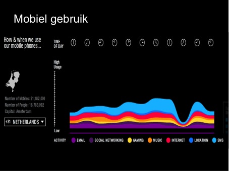 In een internationale studie (n=34.433) deed TNS Nipo onderzoek in 43 landen hoe mobiele telefoons worden gebruikt. Op deze website zetten ze enkele van deze bevindingen uit in interactieve grafieken (erg cool!). De populairste activiteiten in Nederland zijn SMS’en, Internet en E-mail.