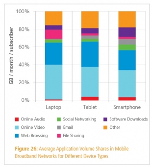 Het “State of the Internet” rapport van Akamai en Ericsson, dat inzoomt op het data gebruik van mobiele apparaten, wijst uit dat online video het meest wordt gebruikt / het meeste data vreet. Browsen is een goede tweede, en wordt met name intensief gebruikt onder tablet gebruikers. Smartphone bezitters zijn daarnaast duidelijk meer into het downloaden van applicaties.