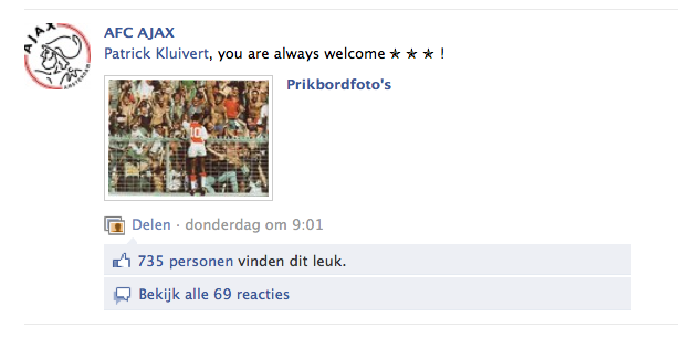 Social media maakt interactie en delen van content mogelijk. Een website bericht is niet geschreven om interactie uit te lokken. Een website zendt informatie het gaat meestal om mededelingen. Twitter tijdens een wedstrijd is een als een radioverslag bij Ajax, erg goed de kracht van het medium gebruiken. Bij Ajax wordt de reactie van de fan opgeroepen. Fans moet je in hun hart raken, het juichmoment naar boven halen. Ajax zet een foto van de een juichende Patrick Kluivert met de tekst: ‘you are always welcome’. Die Facebook post krijgt 735 likes, reken eens door hoeveel mensen je daarmee bereikt. Er wordt ook slim ingespeeld op het laatste jubilieum kampioenschap, bij elk bericht staan de ???
