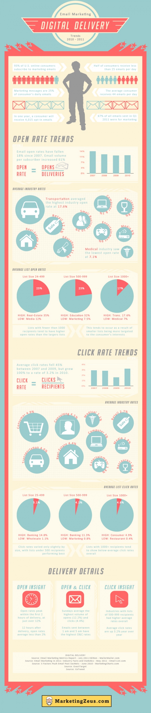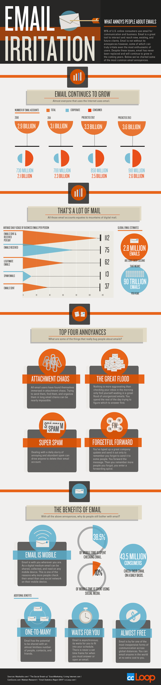 Met ingang van dit jaar bestaan er 3,1 miljard emailsaccounts, waarvan 2,3 miljard consumenten accounts. Men irriteert zich het meest aan het invoegen van bijlagen, de hoeveelheid emails die men dagelijks ontvangt, spam en het vergeten van geadresseerden. Wist je daarnaast dat Rovio (de maker van Angry Birds) gewaardeerd is op 1,2 miljard dollar? Er zijn al meer dan een 100 miljard vogels afgevuurd. Meer infographics over the internet of things, en de ontwikkeling van het verdienmodel van de muziekindustrie.