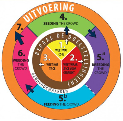 Zoals gezegd, er is geen eenduidige theorie die ons vertelt hoe crowdsourcing toegepast kan worden en hoe een gewenste uitkomst bereikt kan worden. De auteurs van dit boek beogen dit dan ook niet, maar lichten aan de hand van een verscheidenheid aan cases de mogelijkheden toe waar een initiator van crowdsourcing mee te maken krijgt. Om het gewenste, outside-in, effect te bereiken is een basis van inside-out denken benodigd. Deze doelgerichte vorm van crowdsourcing wordt behandeld aan de hand van zeven stappen, samengevat in onderstaand ‘steeringwheel van crowdsourcing’.