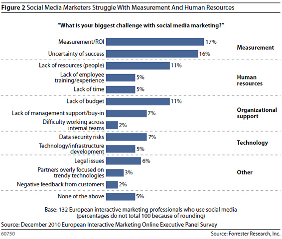 Verder blijkt dat veel interactieve marketeers aanlopen tegen de eigen organisatie; veel van hen hebben moeite met het vrijmaken van budgetten (11%) en mensen (tevens 11%). Een derde van de marketeers spendeert niet meer dan 250.000 dollar aan social media marketing. Opvallend weet 22% niet hoeveel er voor social media marketing is vrijgemaakt. Forrester geeft aan dat marketeers moeite hebben met het vrijmaken van budgetten om de volgende redenen: