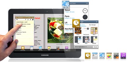 De Galaxy Tab draait op Android versie 3.1. Daarbovenop heeft Samsung nog haar eigen touchwiz op de tab draaien wat zich uit in een aantal widgets die je altijd vanaf de taakbalk onderin kunt oproepen. Zo is er taakbeheer, een agenda, wereldklok, pennotities, calculator en een mp3speler aanwezig. Daarnaast heeft Samsung naast de voorgeïnstalleerde androidapps de Social-en Musichub toegevoegd. Met de Socialhub kun je al je sociale netwerk, instant messaging en mailaccounts in een app samenvoegen. De Musichub is een aanvulling op de standaard mp3speler, hier kun je muziek zoeken, previewen en kopen.