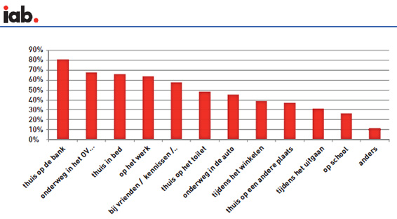 Uit eigen onderzoek van het IAB (n=911) blijkt dat mobiele apparaten vooral thuis op de bank worden gebruikt. In het openbaar vervoer, thuis in bed en op het werk zijn eveneens populair. Zoals eerder onderzoek al uitwees zijn gebruikers erg kien op mobiel, 94% neemt de telefoon altijd mee en 34% voelt stress wanneer ze hun mobiel niet bij zich hebben. Wat betreft mobile advertising zegt meer dan de helft van de ondervraagden enigszins bereid is om informatie over zichzelf te geven om relevante advertenties te ontvangen. 37% heeft de voorkeur voor applicaties met advertenties, dan dat ze er voor betalen. Meer over hoe mensen tablets gebruiken zie het internationale onderzoek van TNS.