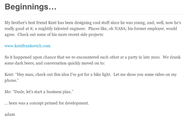 Het voorbeeld dat mij deed besluiten wat verder in deze materie te duiken is Revolights. Een nieuwe manier van fietsverlichting. Een waanzinnig systeem. Relevant. Mogelijk zelfs levensreddend. En dit is het stuk waarmee de bedenkers hun blog op 2 augustus j.l. begonnen: