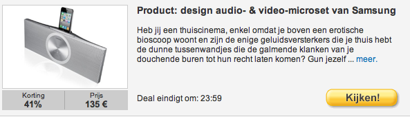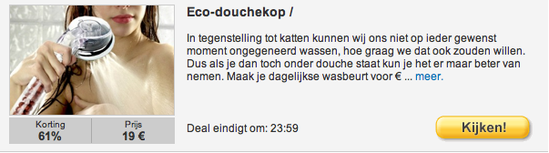 Toevallig heb ik deze week zelf ook weer met verbazing deze teksten weer eens zitten lezen (de eco-douchekop trok mijn aandacht). De .com versie van de site heeft inderdaad ook dit soort inleidende teksten en op de Engelse wikipedia pagina over Groupon staat het volgende: “Groupon’s promotional text for the ‘deals’ has been seen as a contributing factor to the popularity of the site, featuring a distinctive mix of thorough fact-checking and witty humor.”