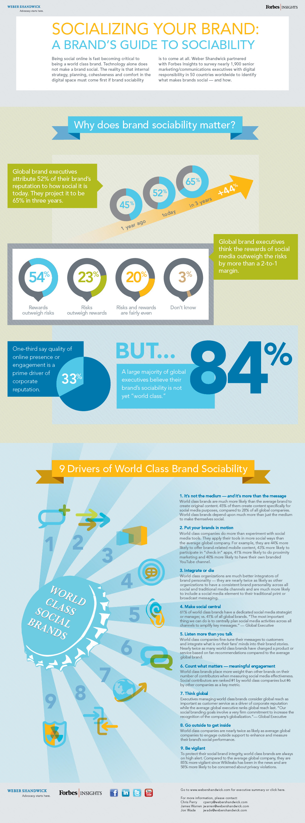 Elke dag worden er alleen al 3,3 miljard Amerikaanse merkuitingen uitgesproken op het web. Managers van grote organisaties schatten dat 52% van de merkreputatie vandaag de dag tot stand komt via sociale media. De verwachting is dat dit binnen drie jaar 65% is. Hoog tijd dus om Word of mouth te omarmen. De 9 drijfveren van ‘World Class Brand Sociability’ en de andere infographics van deze week vertellen je wat je moet weten.