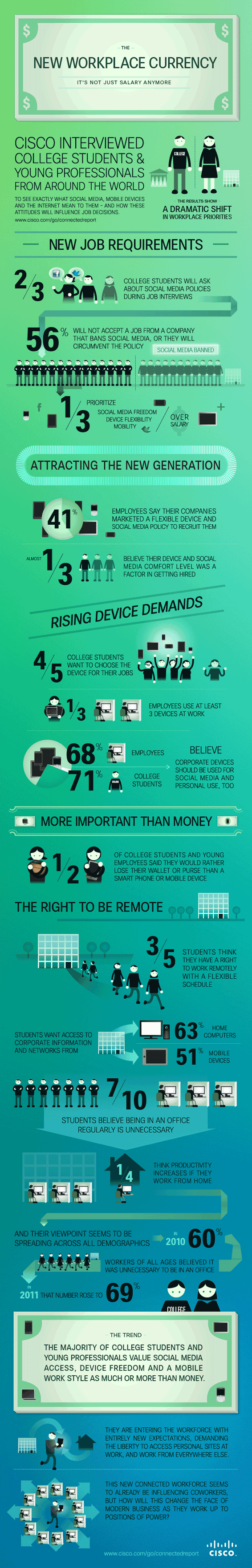 Voor jonge professionals en studenten zijn het gebruik van social media, flexibiliteit in de keuze voor apparaten en de mogelijkheid om thuis of mobiel te werken belangrijker dan het salaris. Die wens is zelfs zo sterk dat dit hun keuze voor een werkgever beïnvloedt, soms zelfs meer dan het geboden salaris. Dit komt uit een onderzoek van Cisco onder 2.800 jonge professionals en studenten.