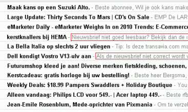 Wanneer je de snippet instelt, staat deze af en toe gecentreerd boven de e-mail. Zo ook in bovenstaande code. Maar is dat nog wel nodig? Verschillende e-mailprogramma’s zoals Thunderbird en Windows Live maken gebruik van een verticaal previewvenster. In dit geval zou een gecentreerde snippet maar gedeeltelijk te zien zijn. Vandaar is het ook belangrijk altijd te testen hoe jouw e-mails eruit zien in verschillende e-mailclients.