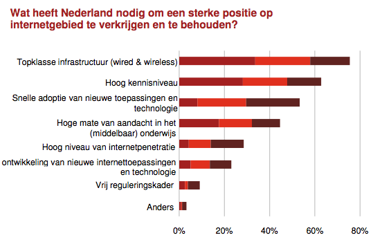 • De zakelijke respondenten zien meer kansen dan bedreigingen. Opvallend is dat zij die kansen hoofdzakelijk zien in een verhoging van de efficiency en mogelijkheden voor beter klantcontact. Relatief weinig zakelijke respondenten (15%) zien kansen in het zelf ontwikkelen van nieuwe innovatieve internettoepassingen of concepten. Investeringen in infrastructuur (77%) en kennis (62%) zijn vereist om Nederland de sterke positie op het gebied van internet te laten behouden en uit te breiden.
