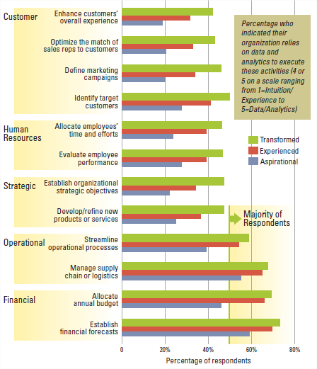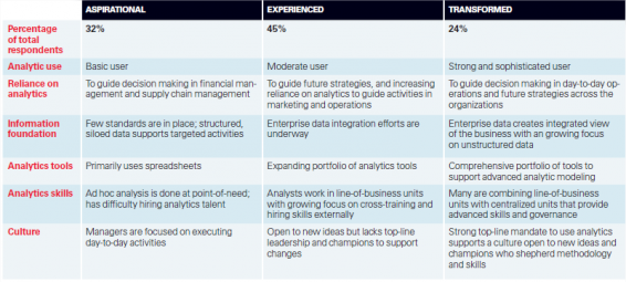 “Analytics: The Widening Divide” is een vervolg op een onderzoek uit 2010 die onderzocht hoe organisaties analytics in hun activiteiten en processen integreerden. Ze hebben organisaties opgedeeld in drie niveaus, Aspirational, Experienced en Transformed: