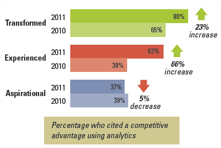 Uit de vergelijking tussen 2010 en 2011 blijkt dat het aantal organisaties die competitief voordeel hebben door gebruik van analytics, gestegen is met 23%: