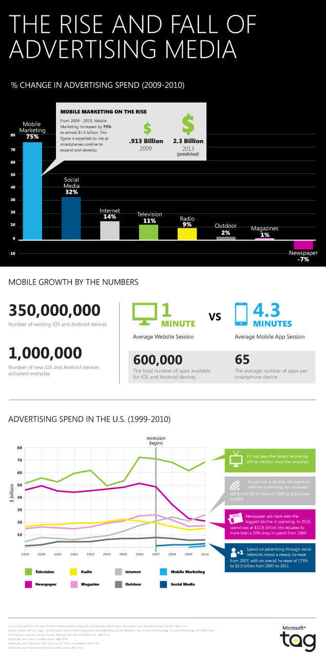 Nielsen toonde enige tijd geleden al aan dat de mediabestedingen in het eerste helft van dit jaar met 0,5% zijn afgenomen. De advertentiebestedingen in de VS laten zien dat TV en internet, net als in Nederland, de belangrijkste groeiers zijn. Trends hierbij zijn mobile en social advertising; de infographics van deze week laten zien waarom. Voor alle soorten online advertising geldt: het meten van de resultaten en de ROI zijn de grootste uitdagingen.