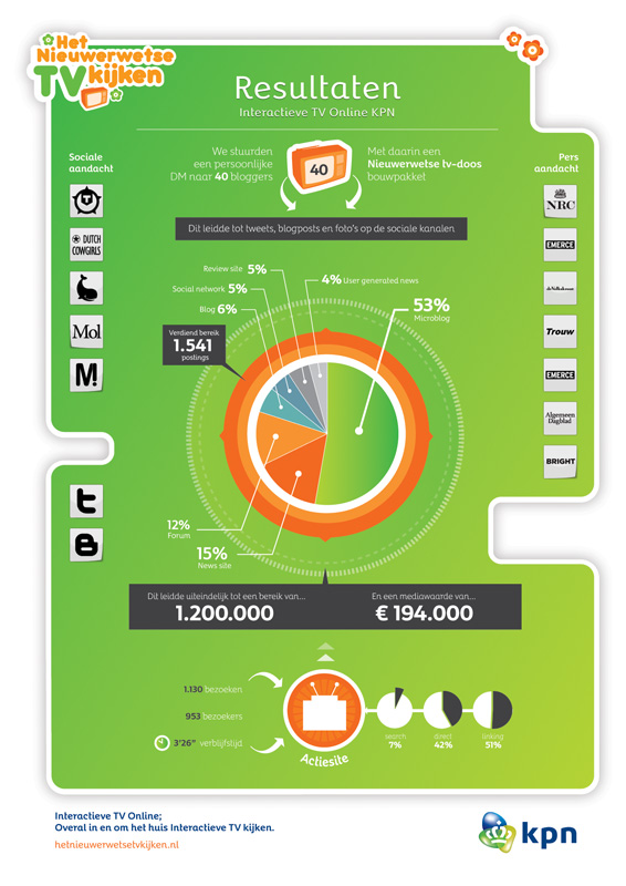 De meeste conversaties vonden plaats binnen nujij.nl. De grootste impact hadden de conversaties van tweakers.net en onemorething.net. Impact van buzz campagne heeft positief effect op berichtgeving rond KPN (gedurende 2×3 dagen toename van ca. 250%). Tijdens en rond het versturen van de DM en het persbericht was het sentiment voornamelijk positief. Ten opzichte van voornamelijk negatief sentiment voor deze introductie.