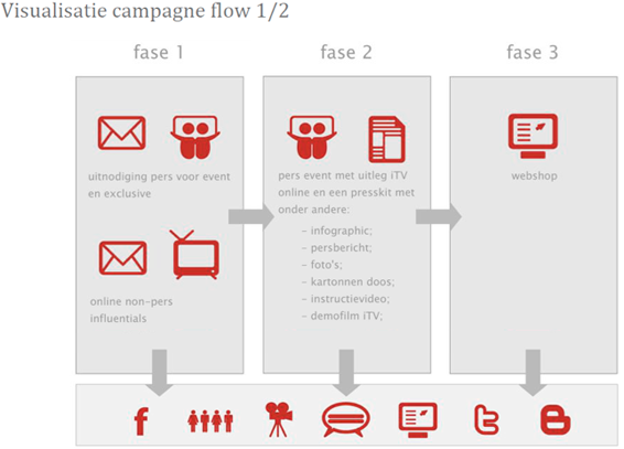 Zodoende werd er een online campagne opgezet. De doelgroep van de campagne is de ‘Digital Entertainment Junkies’. De campagne liep van 23 augustus t/m 9 september 2011. De campagne kende twee fasen, de tease- (1) en lanceringsfase (2). De tease fase was gericht op high influential bloggers, met als doel dat zij over de campagne gingen bloggen, tweeten en foto’s delen. De lancering was gericht op de bloggers die als eerste het product tijdens het event mochten testen en daarna op de landelijke pers.