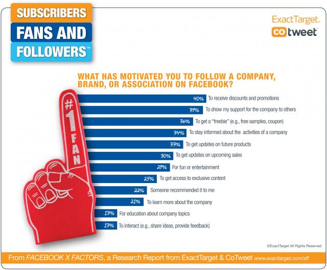 Zo zien we dat voor jongere mensen (19-24) een like vooral te maken heeft met identiteit. Ik like bijvoorbeeld Nike om aan mijn vrienden te laten zien dat ik me daar mee identificeer. Voor de doelgroep 25+ moet er echter iets tegenover staan. Het moet wel degelijk functioneel nut hebben. En het liefst is dat in de vorm van een promotie of iets gratis. Het volgen van een merk of product zien we veel lager in de beweegredenen terug. (bron: The meaning of like, Exacttarget)