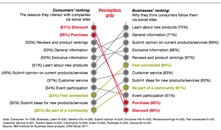 Dat bedrijven dit slecht inschatten, zien we terug in een onderzoek uit 2010 van IBM Institue for Business Value. Hieruit blijkt dat de beweegredenen waarom iemand een bedrijf gaat volgen op social media totaal niet overeenkomen met waarom merken denken dat mensen ze volgen.