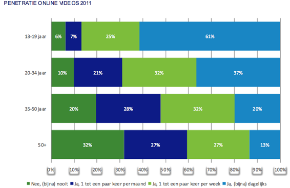 De penetratie van online video is in alle doelgroepen toegenomen. In 2011 geeft 86% van de Nederlanders aan wel eens naar een online video te kijken. In de jongere doelgroep, 13-19 jaar, is een enorme stijging in kijkfrequentie, 66% van de jongeren geeft aan dat zij minimaal 5 dagen of meer per week online video kijken, in 2009 was dit nog 44%. “De redenen om meer online video te kijken is dat er meer content beschikbaar is, de verbindingen verbeterd zijn en mensen hebben meerdere schermen waarop men kan kijken. De groeiende populariteit van de tablet speelt hierin waarschijnlijk een grote rol,” aldus Lauren van der Heijden, directeur IAB.
