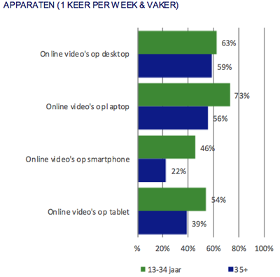 De laptop (86%) en de desktop (78%) blijven populair, maar worden op de voet gevolgd door de tablet (73%) en de smartphone (59%). Doordat er ook veel mobiel gekeken kan worden, wordt er steeds minder achter een bureau gekeken. Het verplaatst zich meer naar de slaapkamer en onderweg.