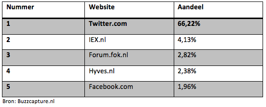 Als het gaat om positieve uitingen is Twitter veruit de belangrijkste herkomst. Met ruim 66% neemt zij het leeuwendeel van de positieve berichtgevingen over de financiële wereld op zich. Ook IEX.nl en het Fokforum doen leuk mee, maar zij redden het niet bij Twitter. Hyves en Facebook weten zich nog net in de top 5 te nestelen met respectievelijk 2,38 en 1,96% van de berichtgevingen.