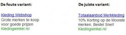 Benadruk de punten waarmee uw bedrijf zich onderscheidt van de concurrentie. Hanteert u bijvoorbeeld geen verzendkosten of heeft u heel bijzondere artikelen/merken in uw assortiment? Vertel het uw lezers! Het benoemen van uw USP’s (Unique Selling Propositions) haalt de lezer misschien wel over om op uw advertentie te klikken en niet op die van de concurrent.