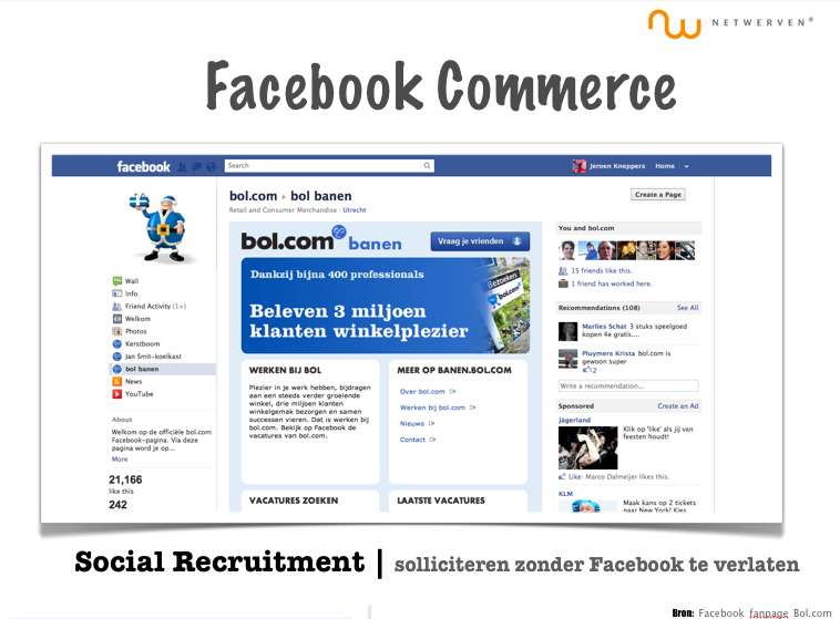 Zorg dat je vacatures goed vindbaar zijn op je eigen site en worden geïndexeerd door Google. Veel bedrijven hebben een “werken bij” site, wat heel effectief kan zijn omdat de doelstellingen van je corporate website anders zijn dan die van je recruitmentsite, en ook weer om het door Google beter vindbaar te maken. Je kunt je recruitmentsite zo inrichten dat terugkerende bezoekers worden herkend en een passende functie krijgen gepresenteerd of, zoals bij Croon Elektrotechniek, bij het ontbreken van een passende vacature worden uitgenodigd om een open sollicitatie op te sturen. Ook je werken bij site kan je volledig binnen Facebook trekken, zoals Deloitte en bol.com hebben gedaan.