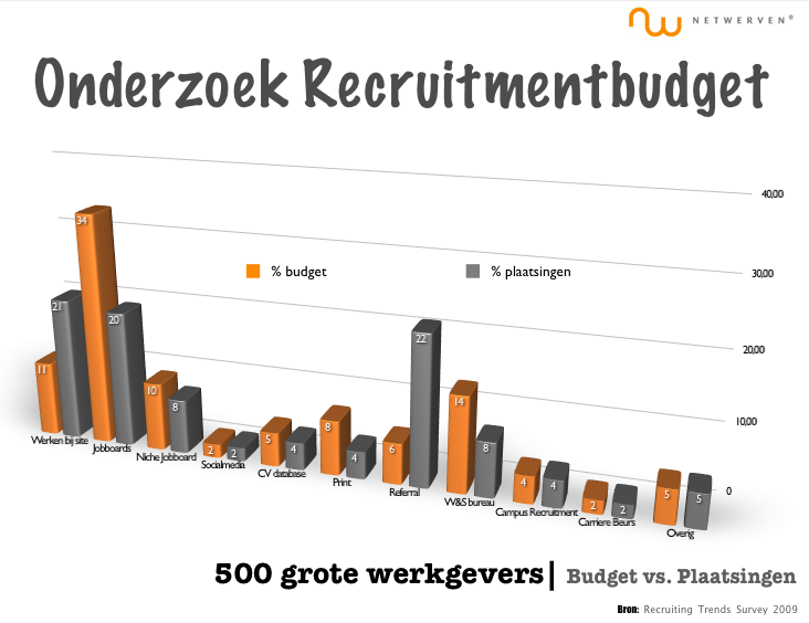 De recruiting trends survey laat zien dat het recruitmentbudget van de meeste bedrijven nu nog vooral naar jobboards en werving & selectiebureaus gaat. Terwijl investeringen in de eigen werken-bij site, socialmedia en employee referral een beter rendement laten zien. Dit lijkt vaak moeilijk aantoonbaar, maar met de inrichting van web analyse is dit goed inzichtelijk te maken.