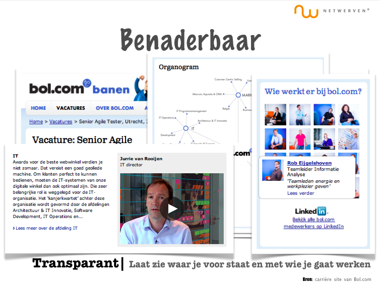 Jeroen deelde een aantal goede voorbeelden van bedrijven die begrepen hebben hoe sollicitanten van nu het beste bediend kunnen worden. Zoals via mijn favoriet, de site van werken bij Bol.com, compleet met organigram, filmpje van de business unit directeur en linkedinprofielen van je toekomstige collega’s. In één oogoplag waar en met wie je gaat werken.