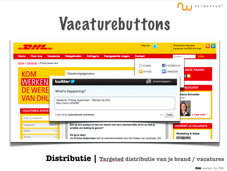Gebruik daarnaast sharebuttons om je vacature te delen, zoals eerder genoemd is het eigen netwerk een sterke referentie. Zet verder eigen medewerkers in om een vacature te vervullen: peer-to-peer communicatie. Zorg dat het verspreid wordt via twitter en facebook of als status-update op LinkedIn.