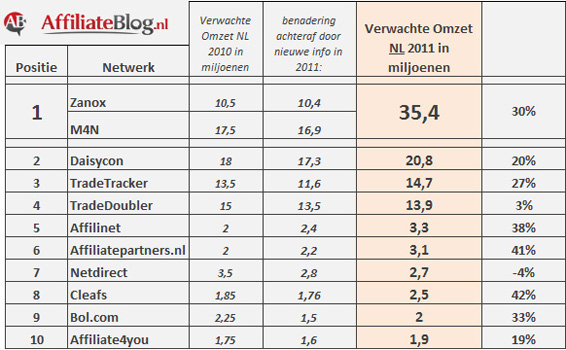 Zanox is in 2011 harder gegroeid dan M4N. Zanox eindigde 2011 zonder M4N met iets meer dan 14 miljoen euro omzet. Daisycon kende in 2011 een gezonde groei en het aantal werknemers groeide van 73 naar ±85. Tradetracker had de groei er in 2011 ook nog fors in zitten. Net als Daisycon focust Tradetracker zich ook steeds meer het buitenland. Daar hebben ze met het toegankelijke & self service systeem en de meer ‘light’ account management aanpak wellicht betere kansen dan andere Nederlandse toetreders. Tradedoubler geeft bijna elk jaar aan dat ze net als vroeger de schouders er weer onder gaan zetten (in 2008 was Tradedoubler nog het grootste Nederlandse netwerk). Volgend jaar zou het zomaar weer eens kunnen zijn dat er een groei met dubbele cijfers in zit. De nummers 5 tot en met 10 groeien over het algemeen lekker mee.
