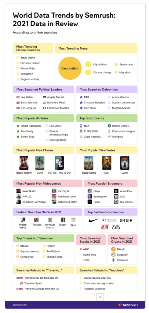 Mocht je in het onwaarschijnlijke geval nog steeds niet gestild zijn in je honger naar inzichten dan is hier tenslotte het overzicht van Semrush. Een van de meest uitgebreide analyses die ik ben tegengekomen. 2021; data in review. Heerlijk om alles dat in 2021 voorbijkwam nog eens even op een rijtje te zien. En er zitten vast zaken tussen die je zullen verbazen.