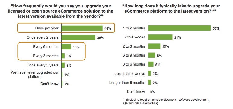 Opvallend is dat online retailers willen inspelen op de veranderende klantbehoeften, maar dat slechts 44% van de online retailers elk jaar het systeem upgradet. Een van de redenen hiervoor is dat het upgraden van het systeem in 76% van de gevallen 1-2 maanden of langer duurt. Dat betekent dat er veel tijd en geld in het upgraden van een systeem gaat zitten.