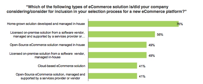 54% van de online retailers wilt dus binnen 4 jaar tijd het huidige e-commerce-platform vervangen. De vier e-commerce-oplossingen die worden overwogen door deze online retailers zijn: