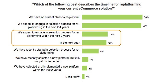 Als gevolg hiervan blijkt uit onderzoek van Forrester dat 25% van de online retailers binnen 2 jaar (en 29% binnen 2-4 jaar) het huidige e-commerce-systeem wil vervangen. Naast de bovengenoemde punten is er een andere belangrijke reden voor het vervangen van het systeem, nl. de hoge kosten die gepaard gaan met het huidige e-commerce-systeem.