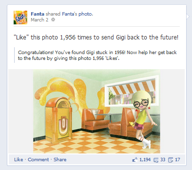 Fanta was één van de eerste merken die creatief gebruik maakte van de nieuwe Timeline voor pagina’s. Op 29 februari postten zij een update die vermeldde dat door schrikkeldag de karakters Gigi, Lola, Floyd en Tristan terug waren geworpen in het verleden en verstopt zaten in de Timeline. Fans kunnen ze terug brengen naar het heden door ze te vinden in het verleden en de berichten waarin ze verstopt zitten leuk te vinden. Zo moet het bericht van Gigi, die verstopt zit in het jaar 1956, hetzelfde aantal likes (1956) ontvangen om terug te keren in het heden. Zeer creatief, maar de interactie die deze campagne genereert valt mij zelf een beetje tegen. Ondanks de 2.7 miljoen fans van Fanta blijft Gigi vooralsnog steken op een schamele 1.200 likes. Dat moet beter kunnen.