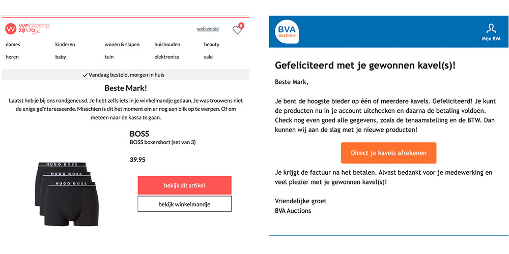 Ga dus geen lange epistels en volledige artikelen in een e-mail plakken. Het gros zal dit niet of niet tot het eind lezen. En vooral: dus niet jouw totale context ervaren. Of daarom zelfs niet jouw hele boodschap meekrijgen. Zorg dat in één oogopslag duidelijk is waarom mensen deze e-mail krijgen en waarom ze hem moeten lezen. En op welke manier ze snel doorkunnen naar een voor hen relevante plek op jouw website. Geef ze een duidelijke call-to-action. Heb je een mooie aanbieding voor mij? Laat maar zien. Moet ik nog een bestelling achteraf betalen? Breng me naar de betaalpagina. Is er belangrijke nieuwe informatie of een interessante casus? Geef me de link naar je blog of whitepaper. Hier twee eenvoudige voorbeelden uit mijn eigen inbox.