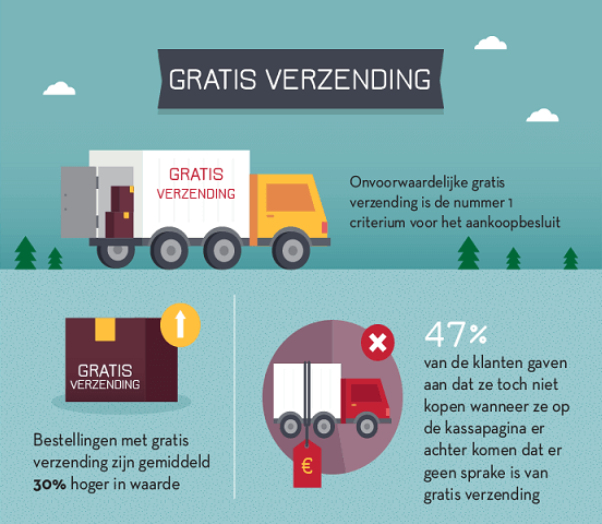 Volgens diverse onderzoeken zijn klanten eerder bereid in een webwinkel te kopen als er gratis verzending aangeboden wordt. Ga dit ook vooral met je eigen webshop testen. Je kunt beginnen met bijvoorbeeld gratis verzending aan te bieden vanaf een drempelbedrag. Zorg ervoor dat je genoeg marge hebt op je producten waardoor je geen geld verliest door het aanbieden van gratis verzending.