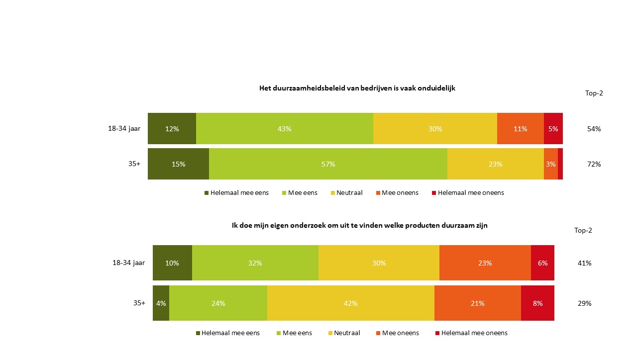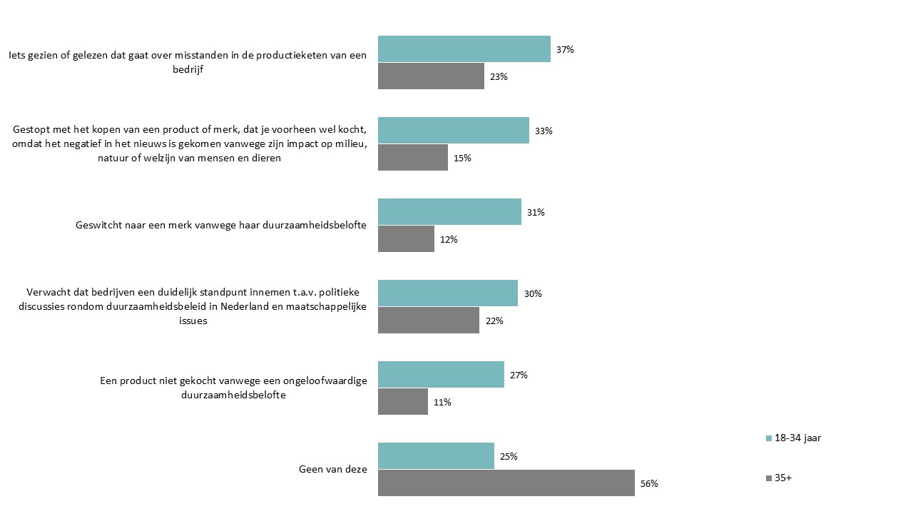 Daarnaast gaf 41% van de 18 tot 34-jarigen aan eigen onderzoek te doen om uit te vinden welke producten duurzaam zijn. 33% van de jongere generatie zegt een product of merk te boycotten vanwege negatieve berichtgeving over impact op milieu, natuur of welzijn van mensen en dieren, terwijl zij dit product in het verleden wel kochten.