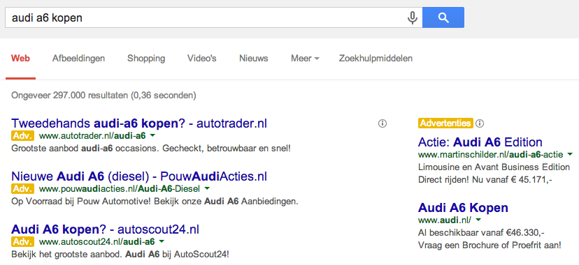 Zorg dat de zichtbare stielink aansluit bij datgene waar de betreffende persoon naar zoekt. In onderstaand voorbeeld is te zien hoe alle adverteerders –behalve Audi zelf- de zoekopdracht ‘audi a6 kopen’ hebben verwerkt in de zichtbare sitelink. Het voordeel van het verwerken van de zoekopdracht in de zichtbare sitelink is de forse verhoging van het doorklikpercentage. Uiteindelijk is dit natuurlijk de bevestiging dat je advertentie aansluit bij de zoekopdracht, de zoeker kan zich identificeren met de advertentie en voelt zich begrepen.