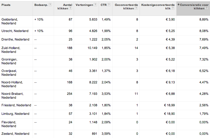 Een belangrijk punt binnen je huidige campagne is de mogelijke geografische verschillen ten aanzien van conversie. Vrijwel altijd bieden deze inzichten reden tot een andere insteek van de campagne. Kijk goed naar de conversieratio’s per provincie, plaats, buurt of gemeente. In de praktijk zien wij veel verschillen in conversiekosten en -percentages afgezet tegen het geografisch aspect.