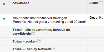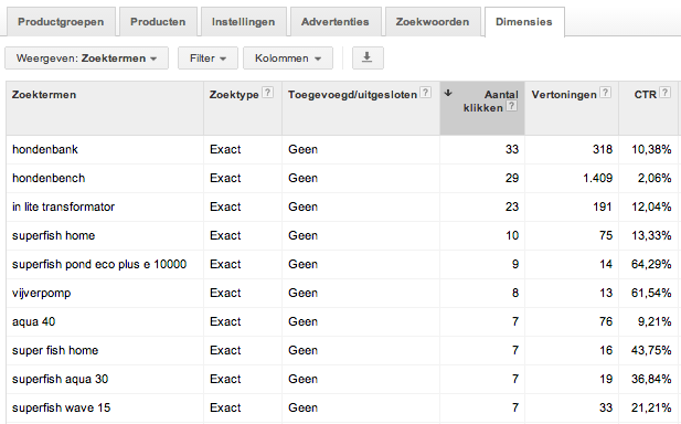 Besteed voldoende aandacht aan de zoektermen waar je binnen Google Shopping op gevonden wordt. Dit doe je middels het tabblad ‘dimensies’. Sluit woorden uit waar je niet op gevonden wilt worden, of waar de kosten hoger zijn dan de baten. Binnen Google Shopping sluit je in de regel altijd ‘exact’ uit. Indien je termen terug ziet die je niet kunt plaatsen is het noodzakelijk om de beschrijvingen in de feed te verbeteren.