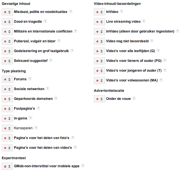 Sluit, voordat je start met de campagne binnen het Google Display Netwerk, sitecategorieën uit. Afhankelijk van het doel van de website is het in vrijwel alle gevallen aan te raden om ‘gevoelige inhoud’ uit te sluiten. Door het uitsluiten van sitecategorieën zorg je ervoor dat de banners niet vertoond worden op websites binnen de betreffende thematiek. Als merk wil je immers niet geassocieerd worden met bijvoorbeeld ‘misdaad’ of ‘dood’. Vaak wordt ‘onder de vouw’ uitgesloten. Dit is echter niet nodig, er wordt immers geen vergoeding gevraagd als deze niet gezien wordt.
