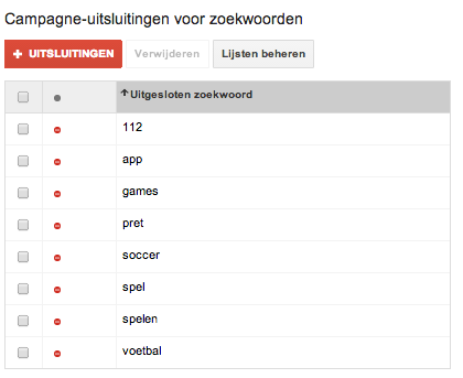 Bedenk vooraf goed welke uitsluitingswoorden je wilt gaan gebruiken. Naast standaard lijsten kijken we altijd nog even goed of er niet meer uitsluitingszoekwoorden zijn. Vergeet ook niet tijdens de campagne uitsluitingszoekwoorden voldoende aandacht te geven. Kijk goed naar de verschillende varianten in woorden en besluit op welke varianten je niet vertoond wilt worden.