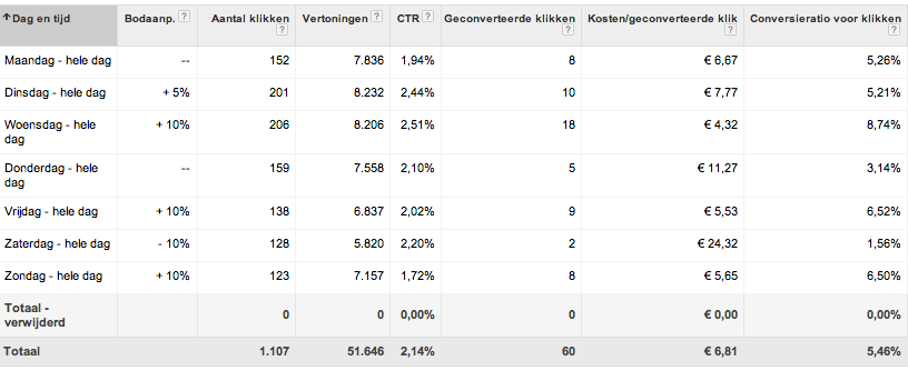 Indien er voldoende data beschikbaar is kun je besluiten om de bodaanpassingen van een respectievelijk gebied te verhogen of te verlagen. Zorg er vanzelfsprekend voor dat je op de goed converterende momenten in tijd en dagen extra biedt. Er zijn immers ook momenten dat er sprake is van minder conversie.
