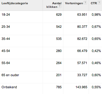 De praktijk leert dat de potentie van optie ‘leeftijd’ binnen het Google Display Netwerk niet of niet volledig wordt benut. Het is enorm relevant om gericht te adverteren op een specifieke leeftijdscategorie of in ieder geval de statistieken omtrent dit inzicht te analyseren. Ook hierbij een kritische noot: het is mogelijk dat kinderen op de ingelogde computer van hun ouders surfen.