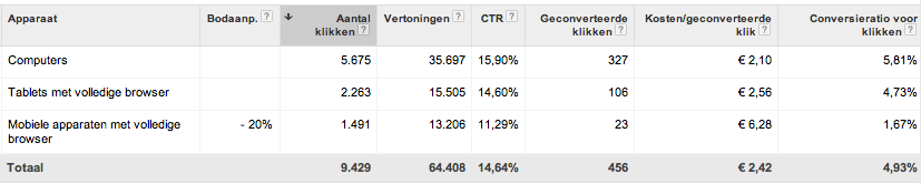 In de praktijk zien we veel verschillen in de conversieresultaten als we dieper kijken naar het type device die bezoekers gebruiken om de website benaderen en uiteindelijk te converteren. Pas de instellingen echter niet alleen aan op de data die je ziet in je AdWords-account. Conversie-attributie is een belangrijk begrip om erachter te komen welke rol mobiele devices hebben in het conversieproces. Splits deze inzichten absoluut uit naar het type kanaal en maak dan de juiste beslissing ten aanzien van je Google AdWords-campagne.