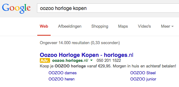 Sitelinks zijn een krachtige toevoeging aan je bestaande advertentietekst. Beter gezegd, sitelinks zouden net zo behandeld moeten worden als de Google AdWords-advertentieteksten. Middels sitelinks geef je zoekers de mogelijkheid om direct door te klikken naar de landingspagina die relevant is op dat moment. In onderstaand voorbeeld zie je dat er onderscheid wordt gemaakt tussen dames- en herenhorloges.
