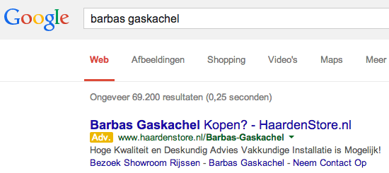 Gebruik tip 8 om dit per op adgroup niveau toe te passen. De advertentie sluit dan pas écht volledig aan bij de zoekopdracht. In onderstaand voorbeeld zie je dat iemand die op zoek is naar een Barbas gaskachel ook een sitelink te zien krijgt die past bij deze zoekopdracht. Dit zorgt ervoor dat het doorklikpercentage fors hoger ligt dan wanneer deze sitelinks niet toegepast zouden zijn. Google bepaalt wanneer welke sitelink toegepast wordt op basis van relevantie.